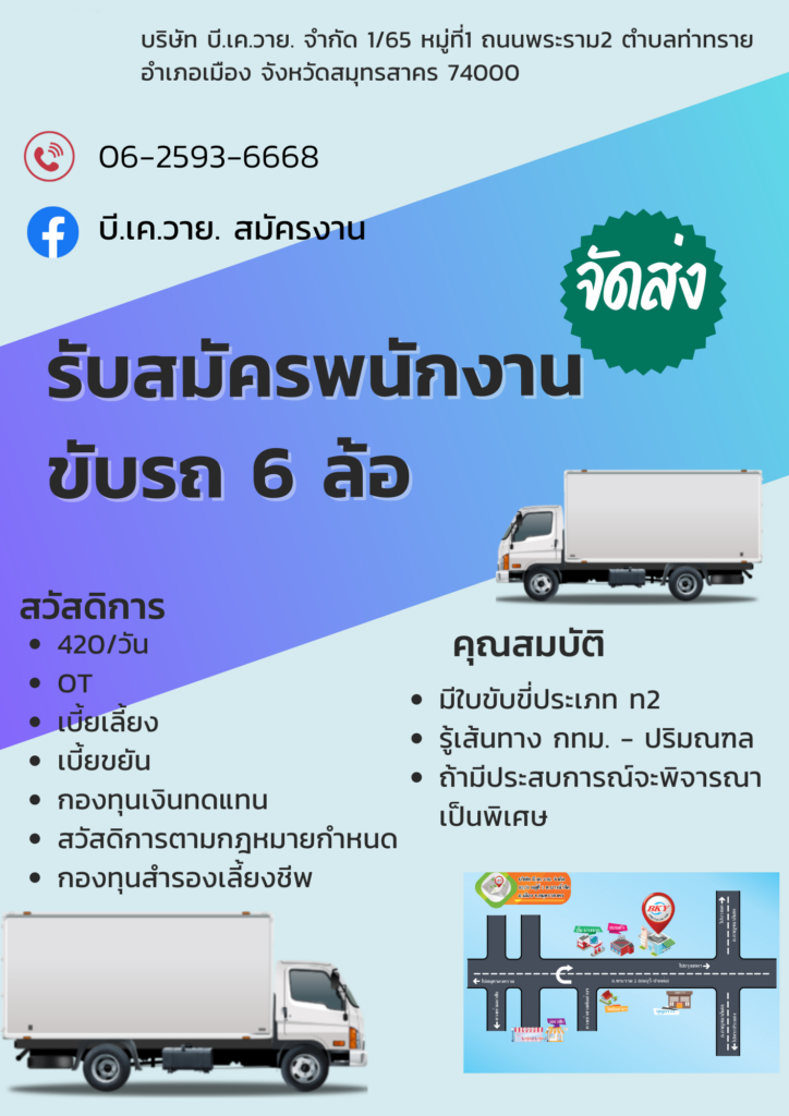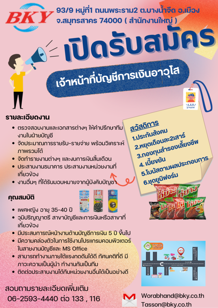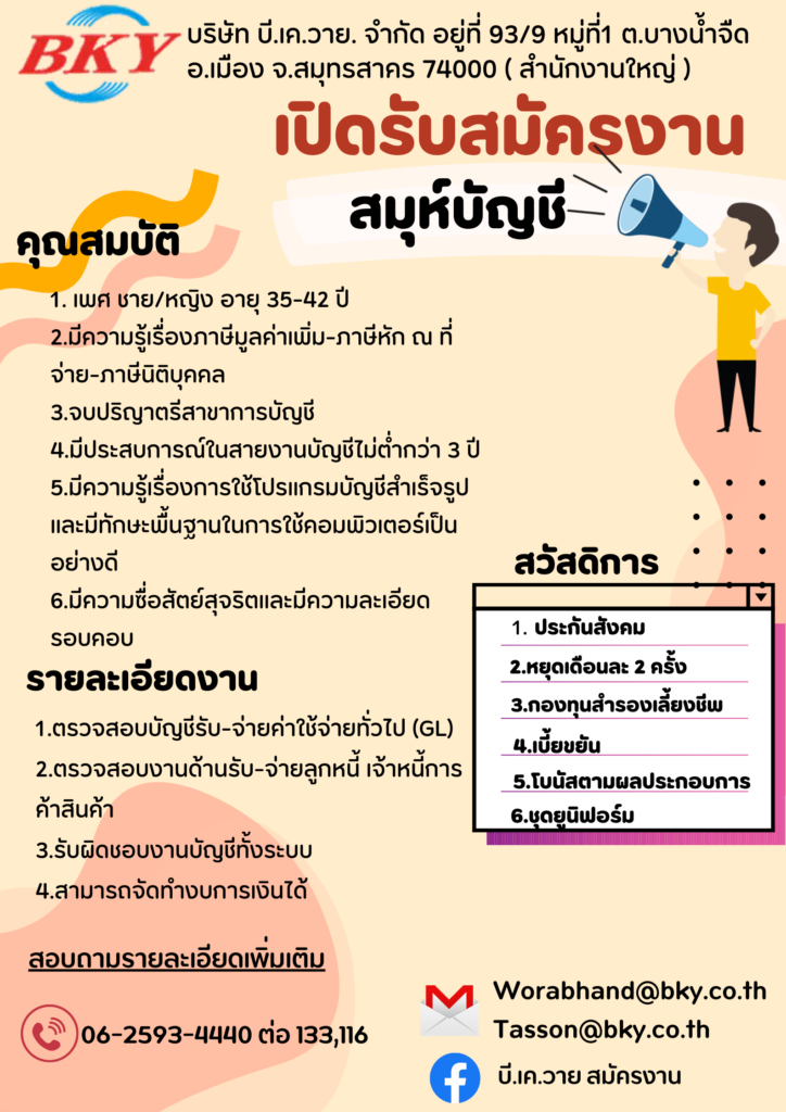 เจ้าหน้าที่บัญชีการเงินอาวุโส สมุห์บัญชี พนักงานขับรถ 6 ล้อ ธุรการขายออนไลน์ กำลังลงข้อมูล สนใจติดต่อฝ่ายบุคคลโทร. : 086-628-2374 , 062-5934440-2E-mail : Hr@bky.co.thบริษัท บี.เค.วาย. จำกัด93/9 หมู่ 1 ถนนพระราม 2 ตำบลบางนํ้าจืด อำเภอเมือง จังหวัดสมุทรสาคร 74000